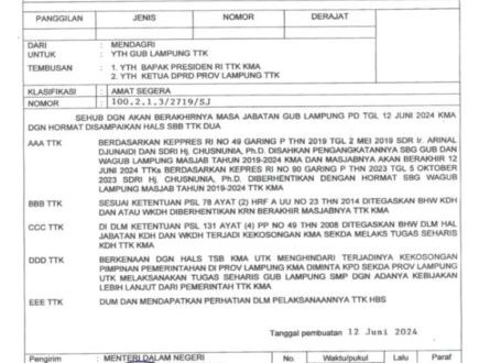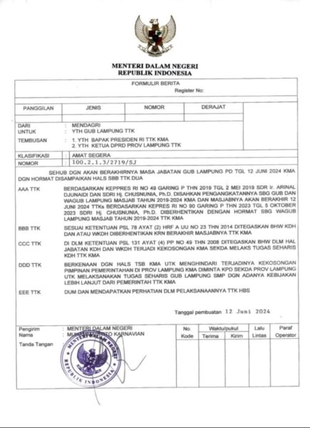 Medioker.Id – Beragam respon dari fraksi DPRD Provinsi Lampung atas terbitnya Surat Keputusan Kemendagri tertanggal 12 Juni 2024, tentang Pelaksana Harian Gubernur Lampung, yang menunjuk Sekdaprov Lampung, Fahrizal Darminto.