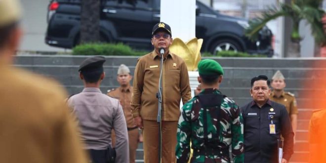 Medioker.Id- Ketua DPRD Provinsi Lampung Mingrum Gumay, menjadi Inspektur upacara pada Upacara Bulanan bersama Forkopimda Provinsi Lampung, di Lapangan Korpri Komplek Kantor Gubernur Lampung, Senin (05/02/2024).