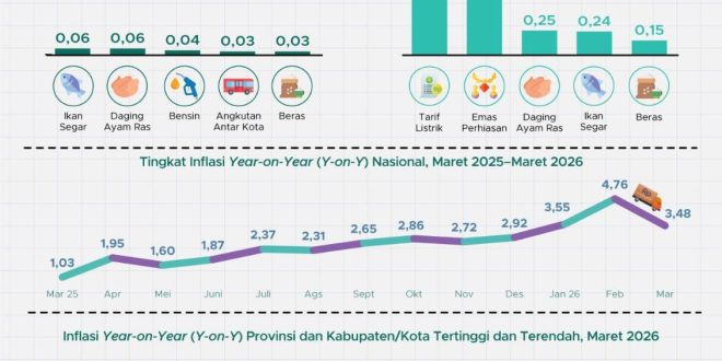 Secara nasional, angka ini menandai tren penurunan dibandingkan Februari 2026 yang sempat mencapai 4,76 persen. Kondisi tersebut mencerminkan mulai stabilnya harga-harga setelah mengalami tekanan pada awal tahun.
